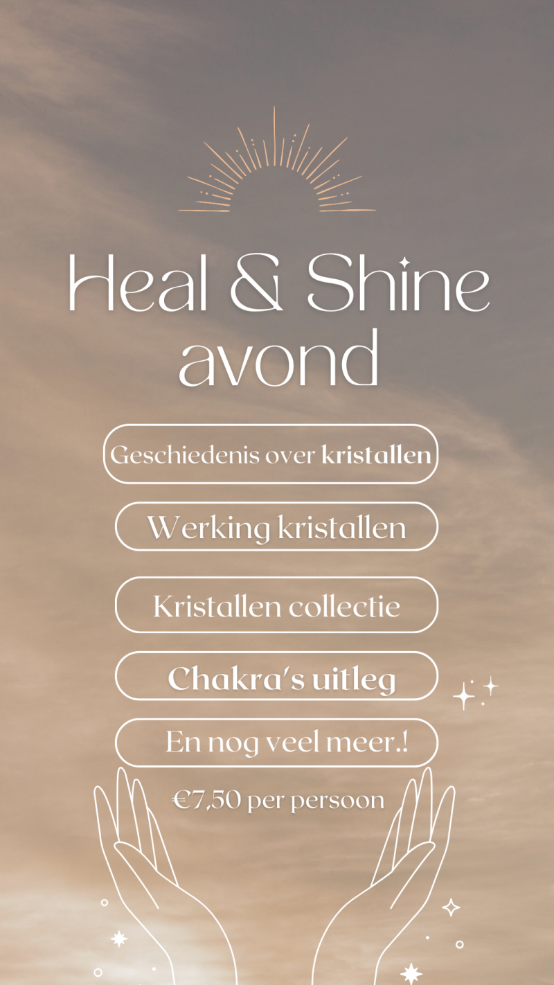 Super leuk dat je interesse hebt in een Heal&Shine avond. Een informatieve gezellige avond samen om meer kennis te krijgen over Kristallen en Edelstenen. Laat je verassen met de magie die de natuur ons gratis geschonken heeft.!